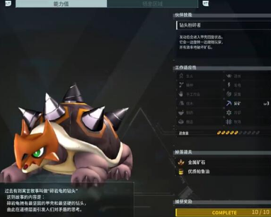 钻头粉碎者:发动后会进入甲 壳回旋状态。它会一边旋转一边 跟随玩家,并有效率地破坏矿石。 |