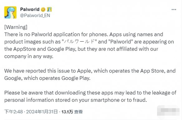 《幻兽帕鲁》官方在X平台发文提醒玩家,目前他们并没有推出手游版应用。