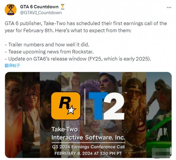 近日,推特博主“GTAVI_Countdown”表示,《侠盗猎车手6(GTA6)》发行商Take-Two计划在2月8日召开2024年度第一次财报电话会议,或将公布以下内容: