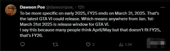 对此,有玩家在评论区表示:“更具体地说是2025年初,FY25将于2025年3月31日结束。这是最新的《GTA6》可能发布的版本。这意味着2025年1月1日至3月31日期间是《GTA6》的发布窗口。我之所以这么说是因为很多人认为四月/五月不适用于25财年,而是26财年。”