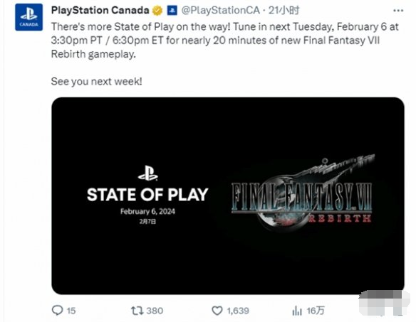 近日,索尼加拿大官推宣布《最终幻想7:重生(Final Fantasy VII Rebirth)》专场State of Play发布会将于北京时间2月7日早7:30举行,并公布一段近20分钟的全新实机演示视频。