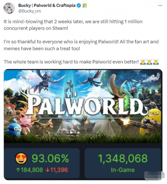 《幻兽帕鲁》人气已在持续下跌,不过目前仍是Steam在线人数第一的游戏,超过了《CS2》。《幻兽帕鲁》社区经理 Bucky 也发文表示,《幻兽帕鲁》已经发售两周了,但Steam同时在线人数峰值仍能达到100万,他对此感到兴奋,并感谢了所有喜欢《幻兽帕鲁》的玩家,目前整个开发团队都在努力的让《幻兽帕鲁》变的更好。