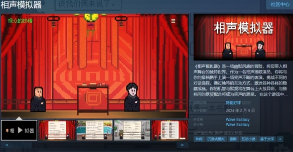 玩《相声模拟器》,当“电子捧哏”。由Wave Ecstacy开发的满满中国特色的游戏《相声模拟器》今日已正式在Steam发售,首周六折优惠,即9元。尽管游戏不是EA版本,但是开发组承诺未来还将继续更新,包括但不限于创意工坊支持、更多语种(语音)本地化。