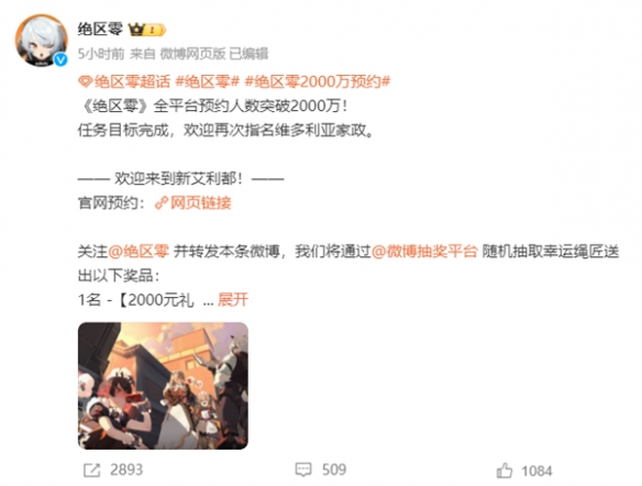 今日,米哈游官方微博宣布,《绝区零(Zenless Zone Zero)》全平台预约人数突破2000万。