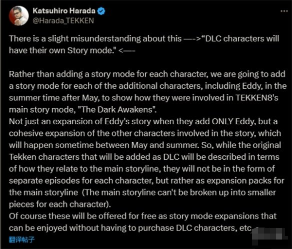 此外,原田胜宏在推特上向粉丝表示,《铁拳8》不会为DLC角色提供单独的故事扩展。相反,游戏将发布“故事中其他角色的连贯扩展”。同时,他还承诺,《铁拳8》的“故事模式扩展”将完全免费,即使玩家没有购买季票或任何DLC角色,也能够享受到这些扩展内容的更新。