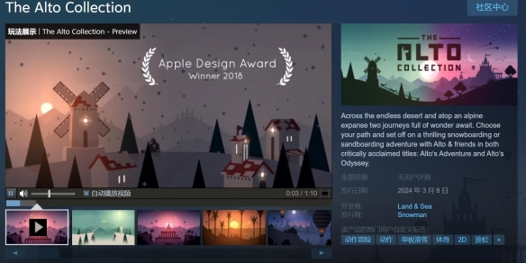 近日,经典滑雪跑酷手游PC版本《阿尔托合集(The Alto Collection)》宣布将于3月8日正式发售,合集包含《阿尔托的冒险》《阿尔托的奥德赛》两款经典作品。