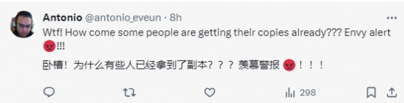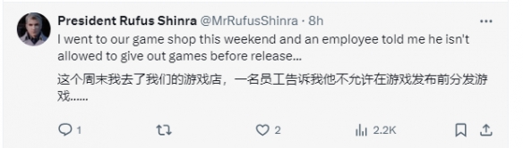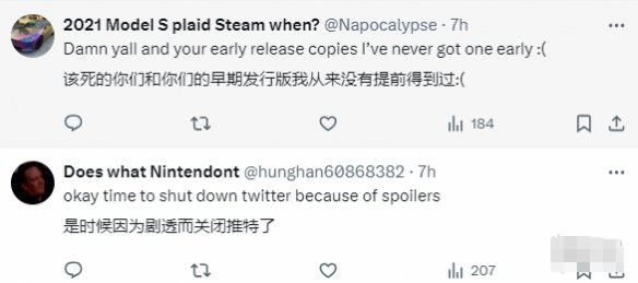 对此,有玩家表示,是时候少看推特了(避免剧透);也有玩家惊讶他能提前拿到游戏,表示当地游戏店店员称他们不被允许提前分发销售游戏。不少网友都表示羡慕坏了。