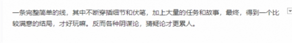 玩家表示,这种完整简单的主线,穿插细节和伏笔,再加上任务和故事,最终得到一个满意的结局才好玩。反而,各种阴谋论、猜疑论才更累人。