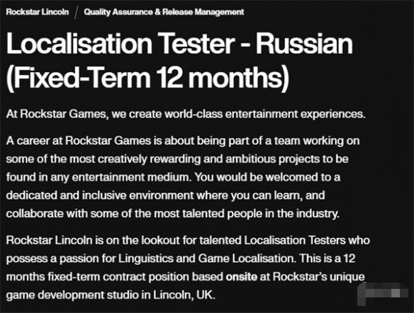 从招聘信息可以看出,开发团队可能已经参与翻译项目一段时间了,并且正在招聘质量保证人员。另外,有泄密者表示,《GTA6》即将进入最后阶段的开发。