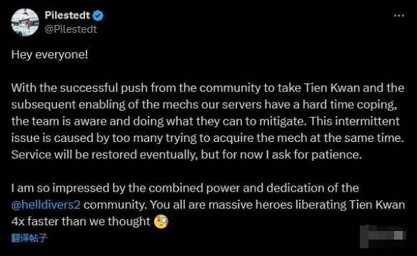 游戏开发商的负责人Johan Pilestedt在社交平台推特上发文表示,玩家解放天关和解锁机甲的速度“比我们预想的要快4 倍”,且只用了一天时间就解放了工厂星球。