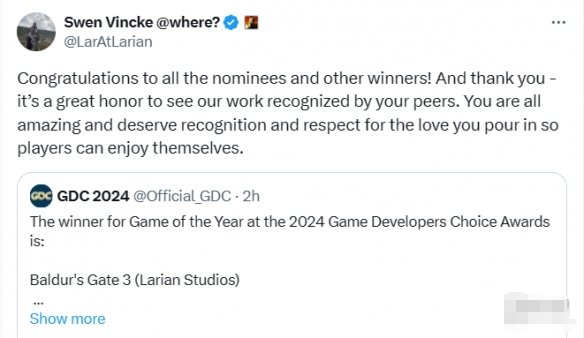 拉瑞安工作室创始人 兼《博德之门3》创意总监Swen Vincke发文表示:“恭喜所有提名者和其他获奖者!谢谢你们,很荣幸看到我们的工作得到各位同行的认可。你们都很了不起,都应得到认可和尊重,因为你们倾注了爱,所以玩家们才能玩得开心”。