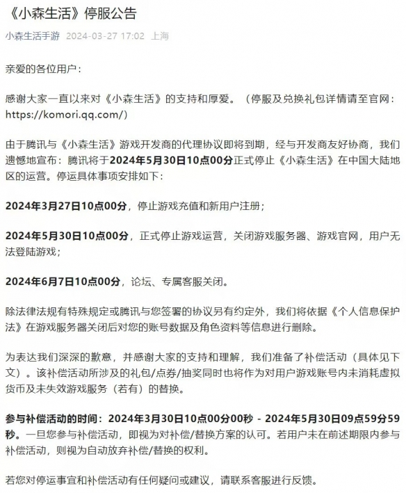 停服的理由也比较简单,是因为腾讯与《小森生活》游戏开发商的代理协议即将到期,经过双方的深入沟通,决定不再续约,从而结束了该游戏在中国大陆地区的运营。