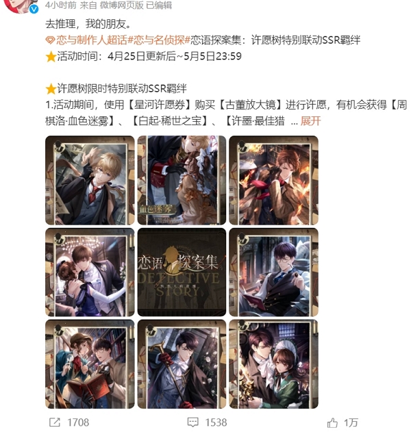 恋与制作人于不久前官宣将于福尔摩斯联动。