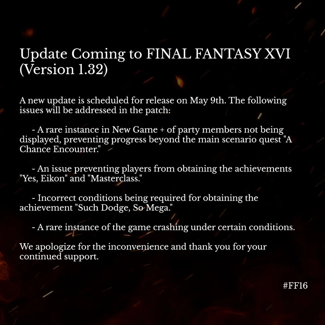 《最终幻想16》官方宣布,新版本1.32版更将于5月9日正式上线,新版本将修复“新游戏+”等问题。