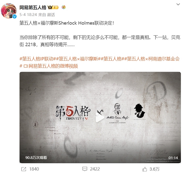 第五人格在最近的最新发布会上发布了最新的联动相关消息,官宣了与福尔摩斯正式的联动。