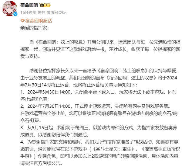 宿命回响(宿命回响弦上的叹息)国服正式宣布停服。