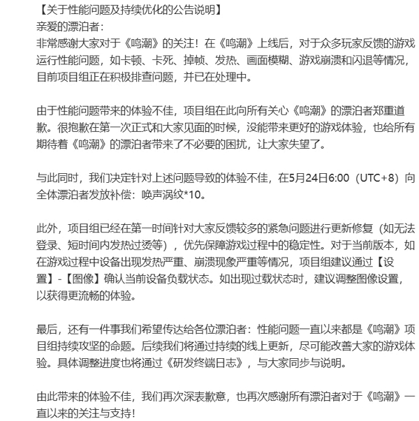24日凌晨时,鸣潮发布了相关致歉公告,并表示相关问题已经在定位优化中。