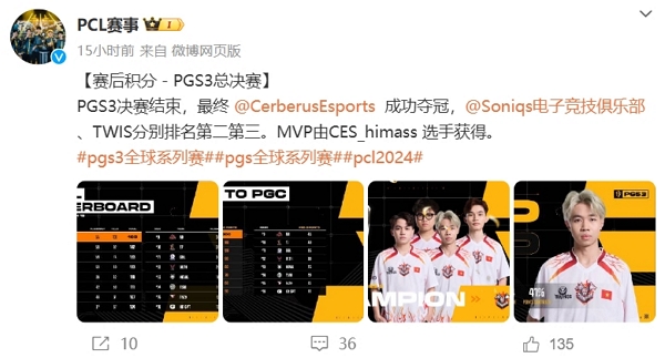 2024pgs3决赛结束 ces夺冠。不久前绝地求生2024pgs3决赛正式结束相关决赛冠军出炉,来自越南的ces战队获得了本次比赛的胜利。希望选手们可以保持最好的状态,迎接接下来的每一场比赛。
