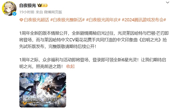 不久前2024腾讯游戏发布会结束,发布会上揭露了有关于白夜极光的相关消息,白夜极光一周年活动将在不久后开启。相关活动将在6月12日正式开放,玩家登陆即可领取全新6星光灵。制作组还打造了一周年中文印象曲《启明之光》