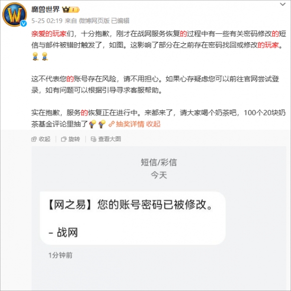 对此,《魔兽世界》官方微博已经对事件进行了说明并道歉,指出是由于工作人员在恢复战网服务过程中意外触发了与密码修改相关的短信和邮件发送,影响了部分之前进行过密码找回或修改的玩家。