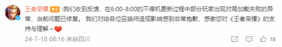 官方表示,由于此次为不停机更新,更新中部分玩家会出现对局加载失败的异常问题,目前相关问题已经修复。