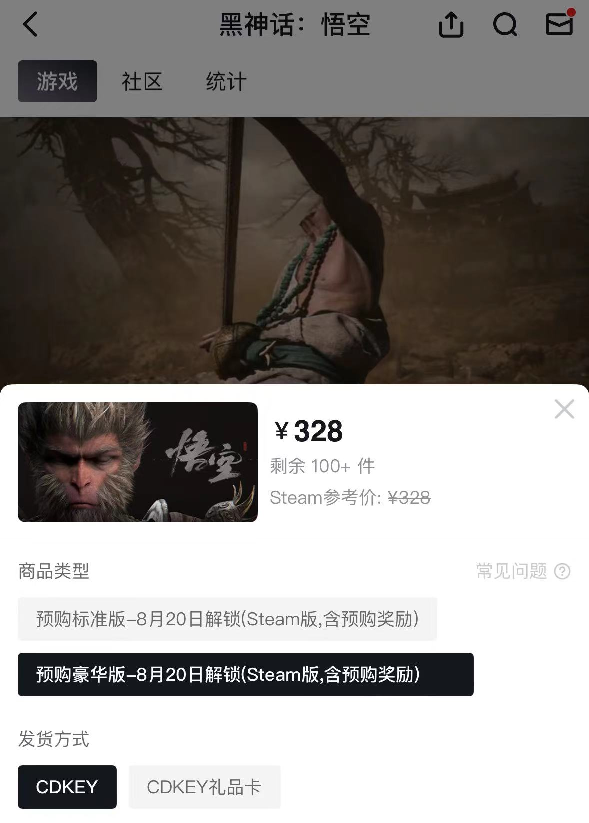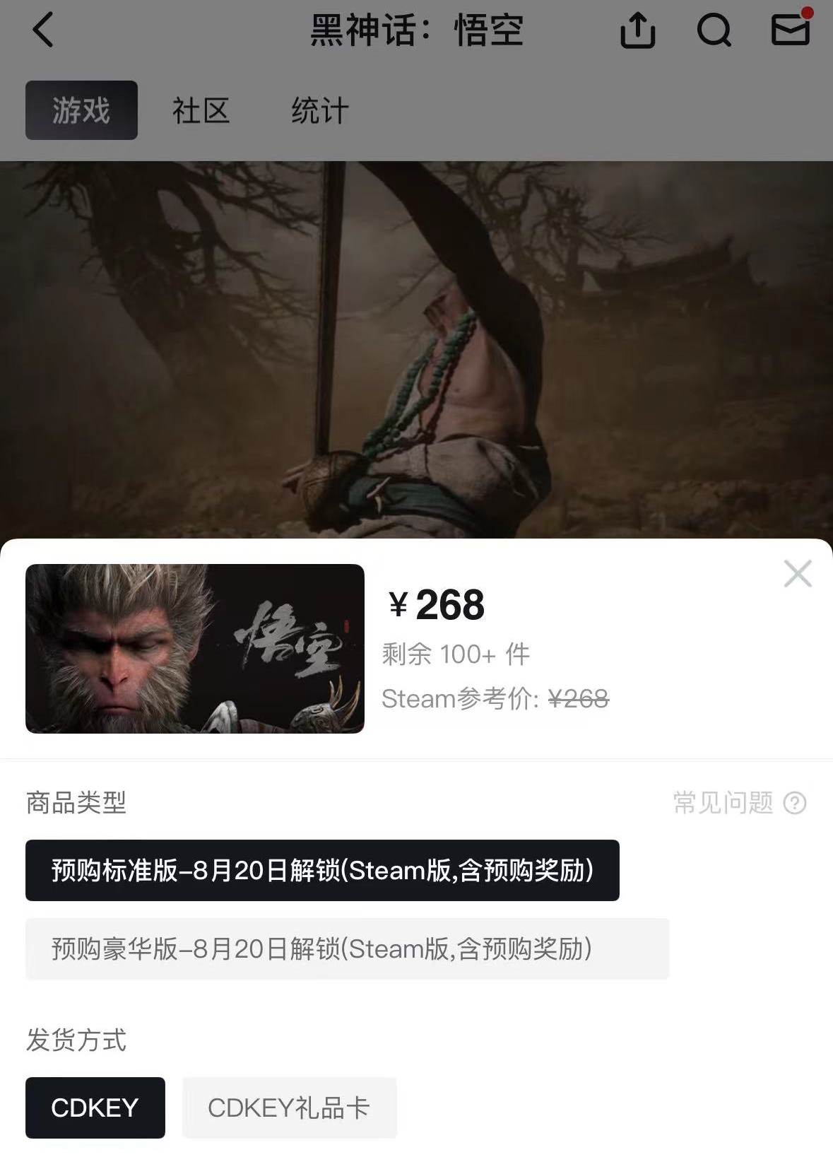 距离黑神话:悟空正式发售还剩一个月,目前小编在某第三方平台上已经看到黑神话:悟空的预购方式。支持标准版:268元和豪华版:328元,还可以通过cdk的方式赠送某第三方平台好友。