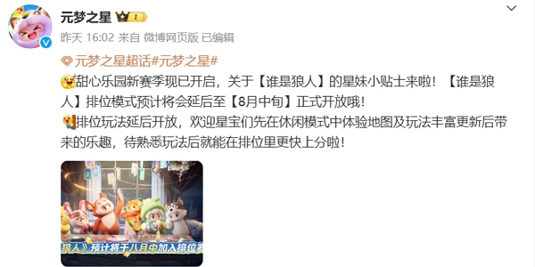 元梦之星甜心乐园赛季当前已经正式开启,意外的是,原定将上线的谁是狼人排位赛模式将延后加入。