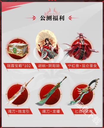 这次玩家可以获得一些公测的福利:瑞霖宝箱*102、胡桃·阴阳姬、宁红夜·星仑圣女、阔刀·烛龙、阔刀·龙蟠、匕首·化魄。