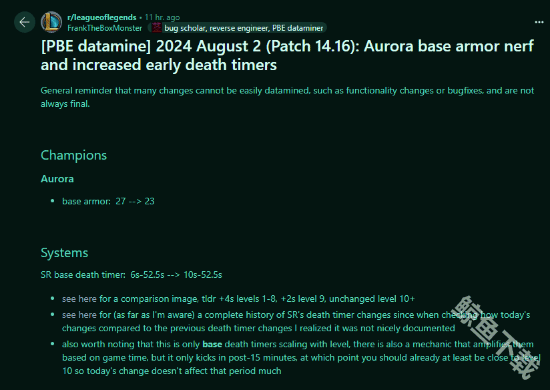 最近一名专门挖掘游戏版本更新数据的玩家分享的英雄联盟(LOL)14.16版本的英雄的复活时间,前十级每一个阶段的复活时间都增加了几秒。这次改动一定会影响比赛的进程,无论是玩家还是电竞比赛,都有可能导致死亡后来不及复活导致输掉关键战役。