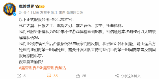 魔兽世界官方正式宣布,游戏中的部分服务器完成扩容,服务器包括:死亡之翼、白银之手、燃烧之刃、霜之哀伤、罗宁、托塞德林。之前重新回归的信息已公布就引发了诸多玩家的兴趣,这也为游戏的服务器增加了很多不必要的拥堵和困扰。