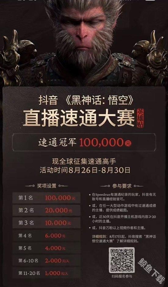 随着8月20日的即将临近,黑神话悟空也是发售在即,同时抖音官方也在近日宣布将举办一届黑神话悟空的速通大赛,将于8月26日至8月30日期间举行,冠军的奖金将高达10万元,现全球征集速通高手。