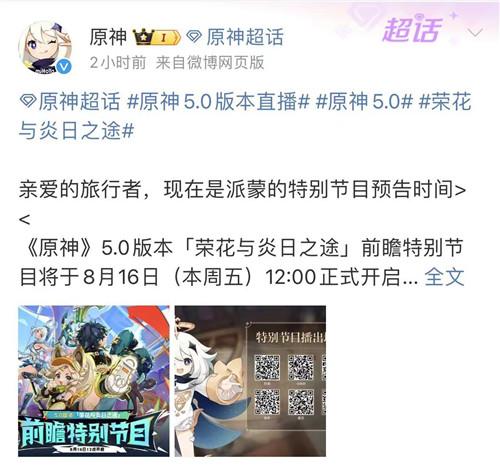 原神官方在今天(8月13日)中午12点发布了一条微博并宣布,原神5.0版本荣花与炎日之途前瞻特别节目将在8月16日(本周五)中午12点正式开启。在本次节目活动当中,大伟哥将与开发组的同学一起,给大家带来5.0版本的更新内容,直播间内还有兑换码等福利掉落。