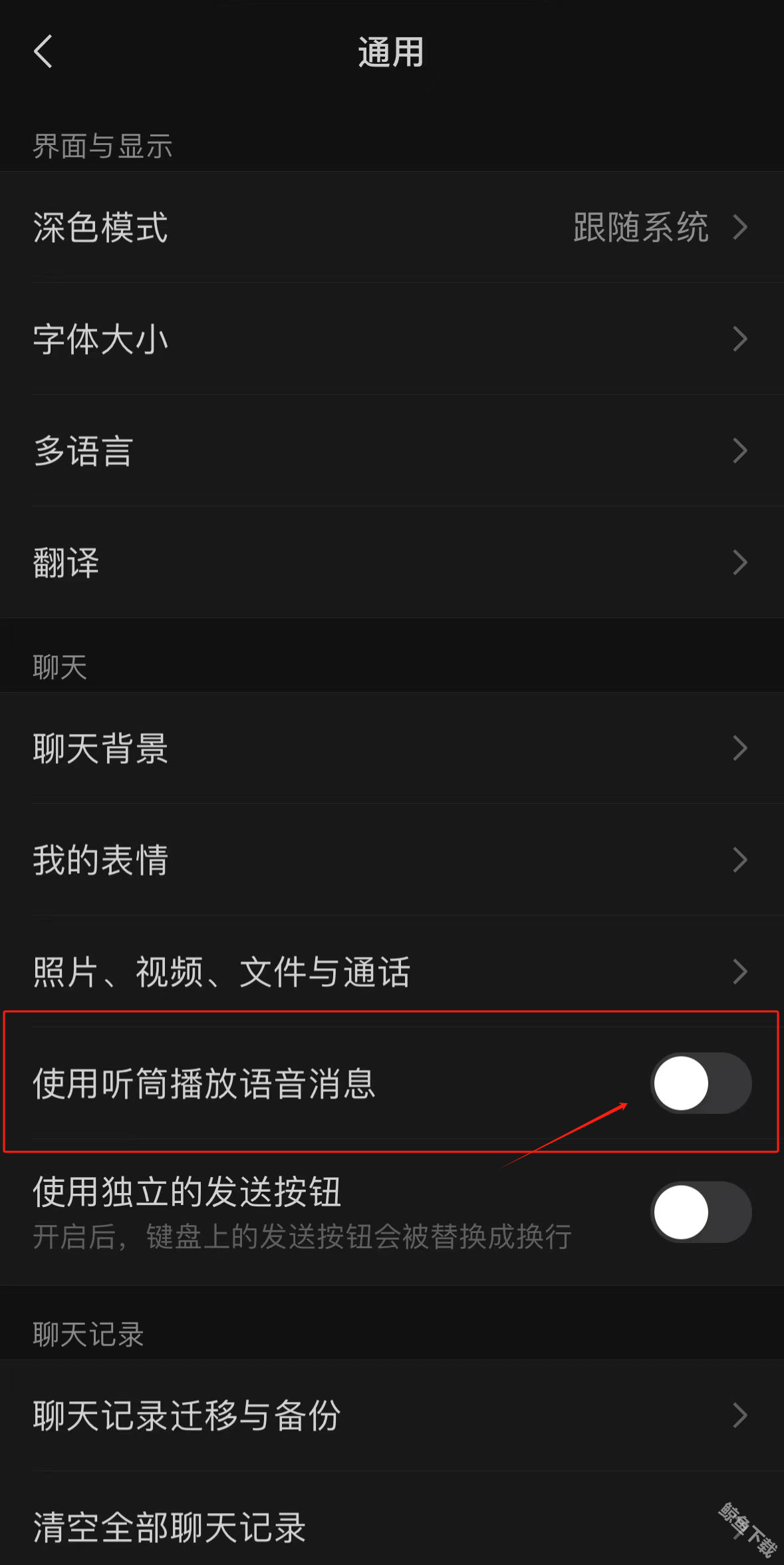 3、找到【听筒播放语音消息】可以按照你的需求开启或者关闭,开启就是听筒模式,关闭就是扬声器模式