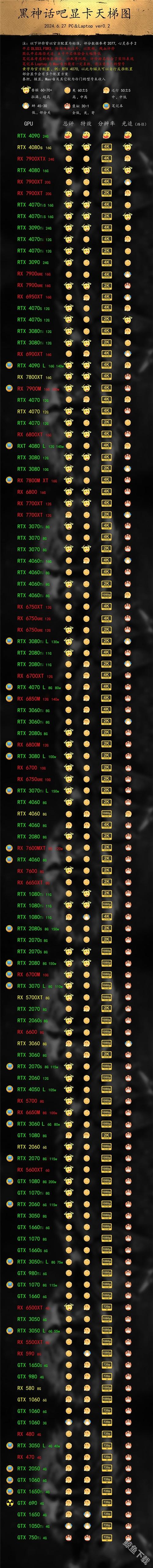 同时玩家们也可以提前为游戏准备起来,看看自己的设备能否到达高帧数,测试一下自己的游戏兼容性,并为广大玩家提供一张黑神话悟空的显卡天梯图。