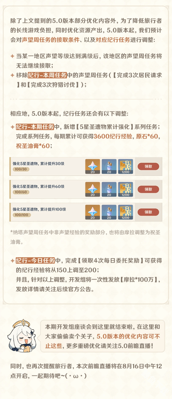 原神5.0版本「荣花与炎日之途」前瞻特别节目将于8月16日(本周五)中午12:00正式开启,敬请期待。
