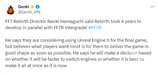最近最终幻想7重生总监接受采访时透露,这款游戏在发售前已经经历了四年的开发时间,而且又很多开放的工作是与最终幻想7重制版同步进行的。这名总监也是透露,在一年之内会推出适用于ps5平台的升级版本,并且还能累计ps5平台的开发经验。