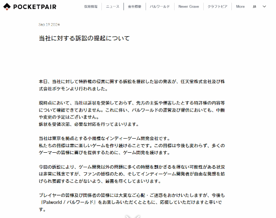 就在昨天的下午,幻兽帕鲁开发商pocketpair发布声明,官方回应这次任天堂和宝可梦公司联合起诉侵权的诉讼作出了回应。官方表示目前还暂未收到诉讼书,无法确认对方诉讼的内容是主张或涉嫌侵犯专利权的内容,所以展示还没有计划暂停或改变幻兽帕鲁的方式和内容。