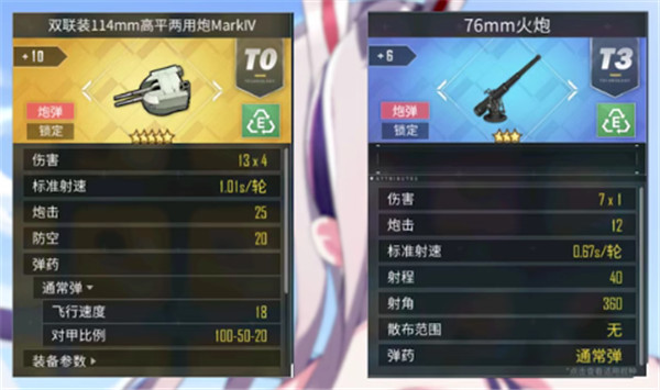 双联装76mm高射炮T3(俗称76炮):射速极快,能高效触发全弹幕,是岛风的优选主炮之一。