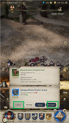 齿轮属性因附魔效果不同,优质装备用绿色箭头标注。