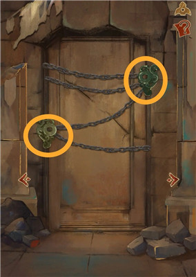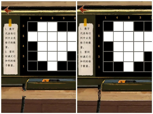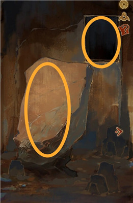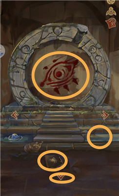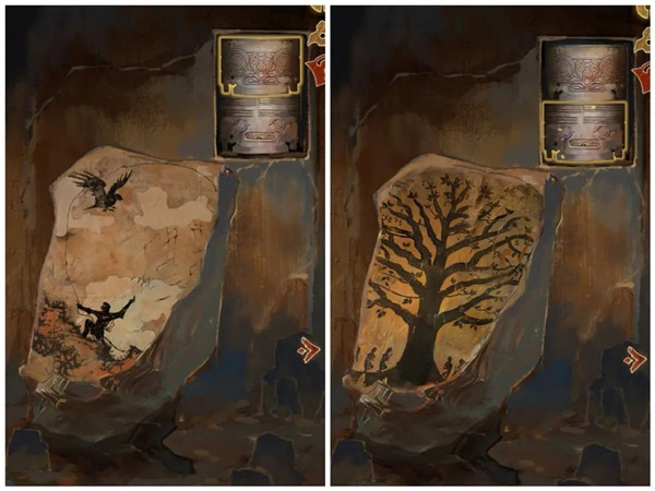 将两个神人面具放入最左边场景右上角的空白方形区域,依次点击面具,前方的大石块上会显现两个图案。