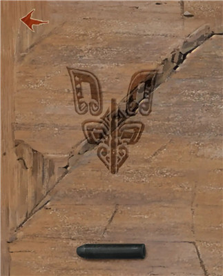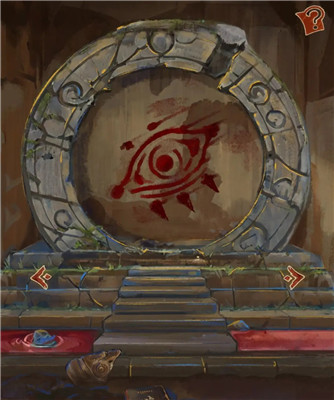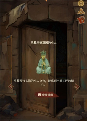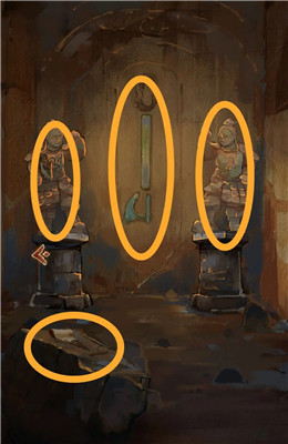 在雕像前的大石块上拓印出一个图案,点击左右两侧的雕像,得知一个雕像需要武器,另一个雕像需要纹饰图案。将拓印的图案放到左侧雕像上,得到神人面具。