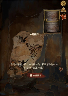返回中间场景,将门右上角的鸟型玉牌取下,放置到大树图案上,获得捕网。点击另一个面具上石块上的人和鸟的图案,将网补全。