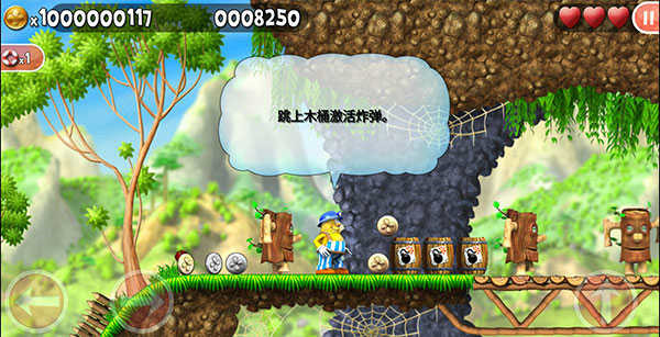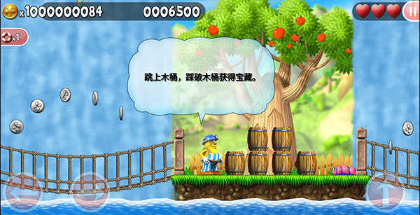 6、在关卡中,您还能收集多种奖励道具,例如跳上木桶并踩碎它,就可能获得金币、额外生命或其他宝藏,为接下来的挑战提供助力