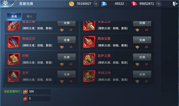 兑换选择:玩家可以根据自身需求,在兑换商城选择不同类型的圣器,确保资源合理利用,最大化战力提升。