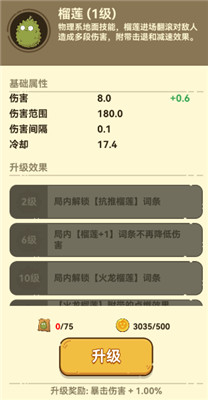 榴莲是一个物理系地面植物,具备独特的攻击方式。当榴莲在战场上滚动时,会对路经的敌人造成多次伤害,并且具有击退敌人和减速敌人行动的效果。榴莲的高频次伤害和减速效果能有效打乱敌人的进攻节奏,为防线提供重要的支援。