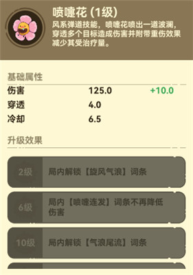 喷嚏花是一种风系弹道植物,能够喷射出一道强力气流。气流可以穿透多个敌人,并对每个敌人造成伤害。除此之外,喷嚏花还会附带重伤效果,降低敌人的恢复速度,让敌人在持续受到伤害的同时无法及时恢复血量,极大地削弱了敌人的战斗力。