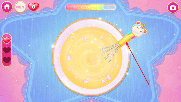 接下来,点击搅拌器,开始顺时针搅拌面糊,直到面糊变得光滑和均匀。这是蛋糕制作中非常关键的一步,要确保搅拌均匀,以便后续的烘焙过程中不会出现问题。