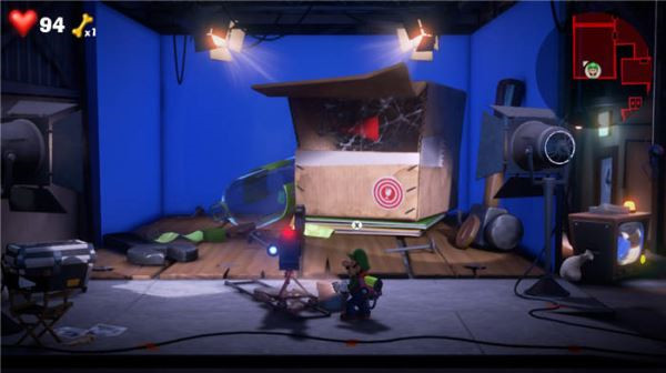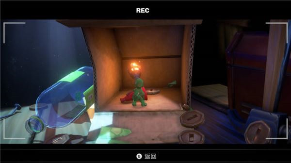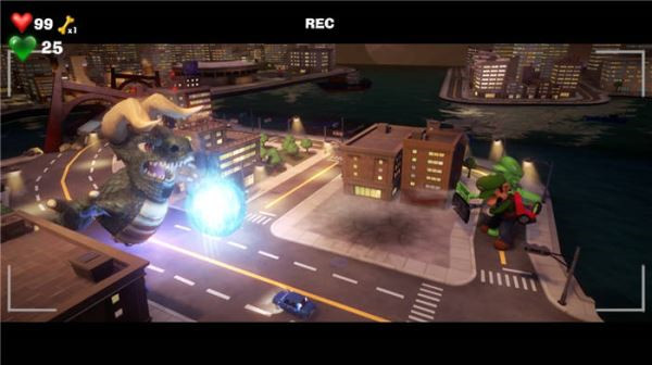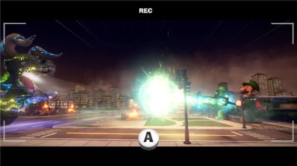 11. Boss战——对抗小怪兽:在电影拍摄的剧情中,路易吉需要击败一只巨大的怪兽。怪兽会释放气功波,我们需要同时操作路易吉和傀易吉,在怪兽释放气功波时,使用吹风(ZL+ZR) 将气流反弹回去。成功反弹三次后,怪兽会进入虚弱状态,趁机进行攻击,最终完成电影拍摄,并拿到电梯按钮!