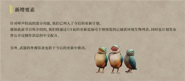根据玩家的反馈,我们也将在后续更新中加入一些新的功能,包括已捕获环境生物的预览列表、中文配音选项、武器外观装备等。这些新增内容将在5月末的更新中发布,旨在为玩家带来更加丰富的游戏内容。