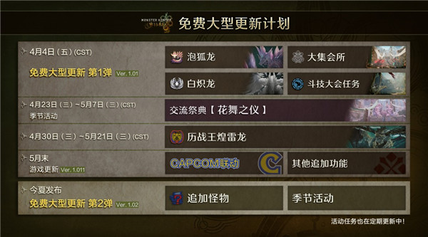此外,Capcom还通过官网发布了4月和5月的更新内容计划,透露将在未来几个月内进行一系列更新与优化。包括系统改进、新增内容、怪物挑战、武器平衡调整等,旨在让玩家在怪物猎人荒野中体验到更加丰富、充实的狩猎冒险。